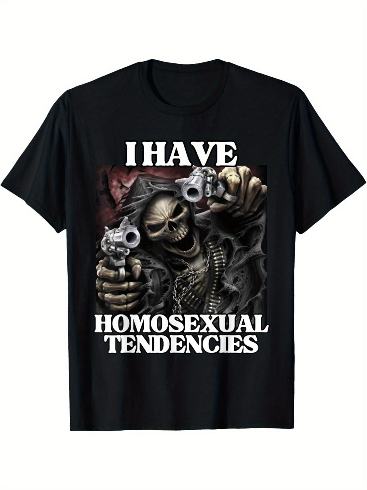 Features the grim reaper holding two handguns like he just shot up the comment section of a men’s mental health video. Behind him: rage. Inside him: desire. Across the chest: truth.