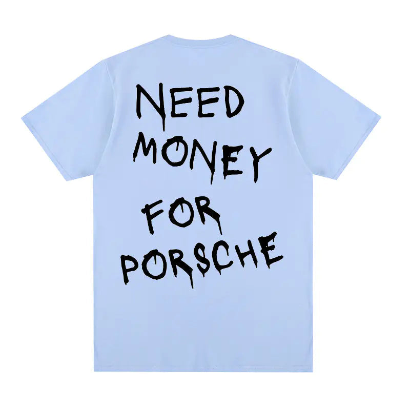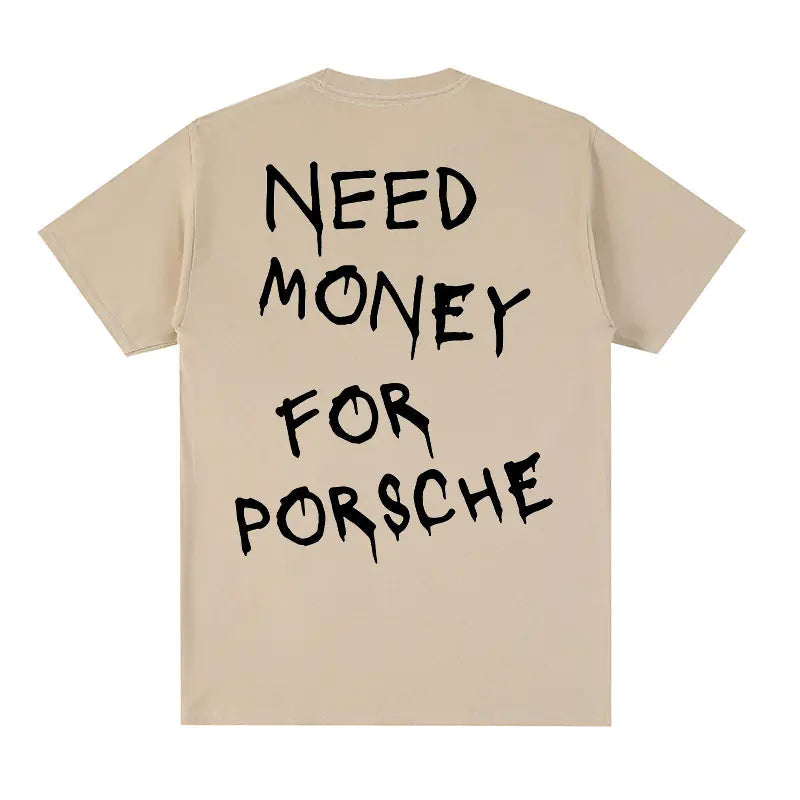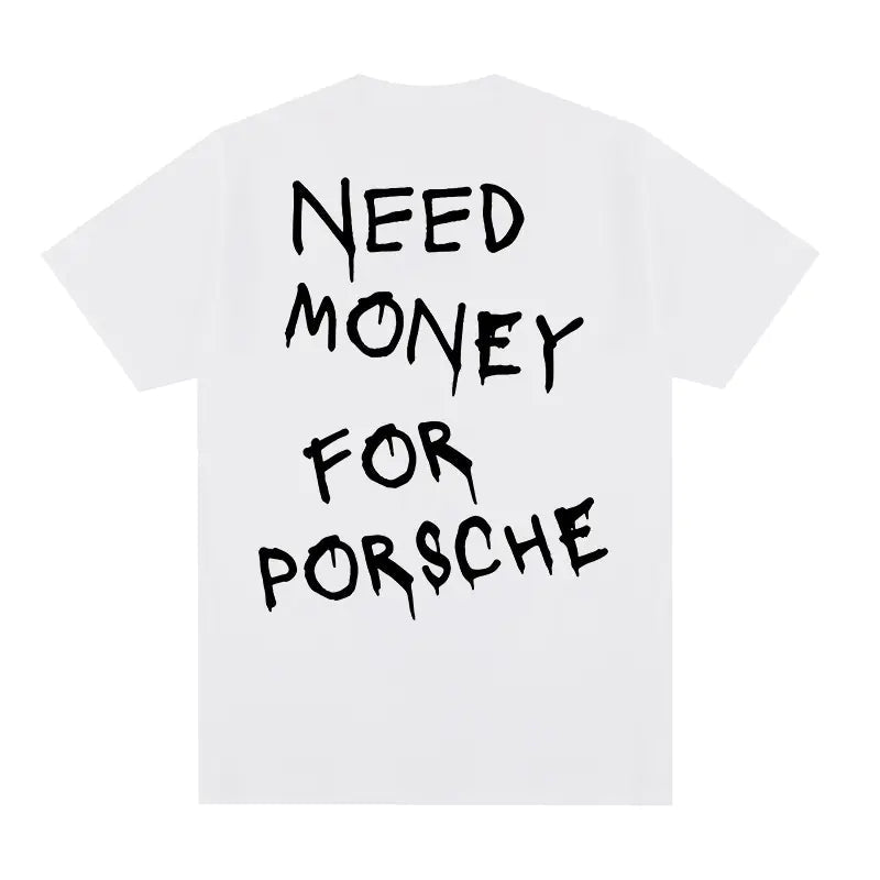 The “Need Money for Porsche” tee lets the world know your priorities are straight: you don’t want help, you want horsepower. Printed in ransom-note lettering that screams both “I have a dream” and “I might sell you a cursed NFT,” this shirt is the perfect blend of high ambition and low bank account.